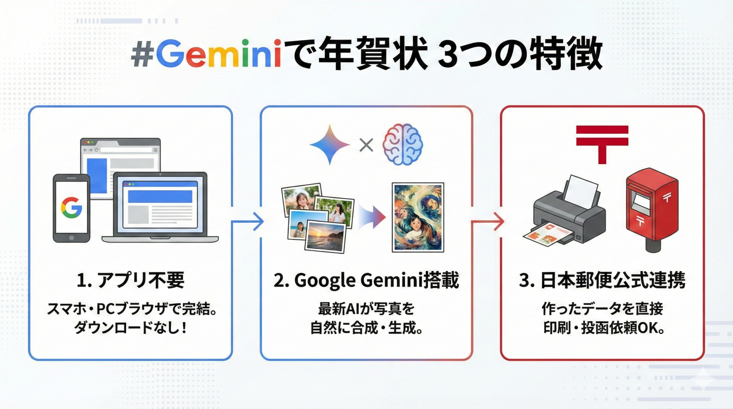 2025年12月15日、日本郵便とGoogleがタッグを組んでリリースしたのが、「#Geminiで年賀状」です。