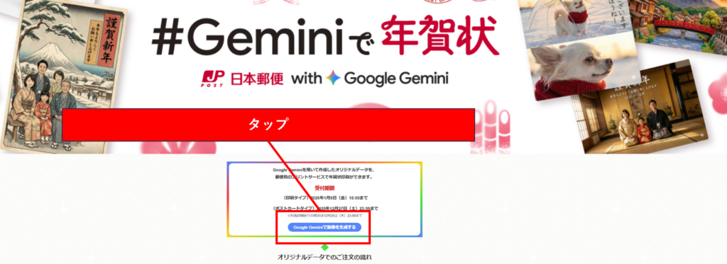 特設サイトにアクセスし、「Google Geminiで画像を生成する」をタップ