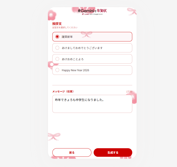 「#Geminiで年賀状」は、日本郵便がGoogleの技術協力を得て提供する、生成AIを活用したWebブラウザ完結型の年賀状作成サービスです。