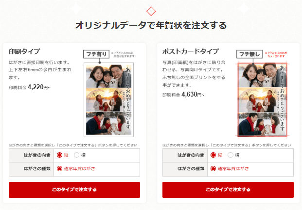 「オリジナルデータ」で注文するメニューを選び、先ほど保存したAI画像をアップロードします。 ここで、「謹賀新年」などの文字入れやスタンプ装飾を行うことも可能です。