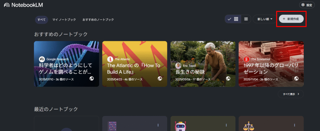 ・NotebookLMのノートブックを「新規作成」を押下し、開きます。