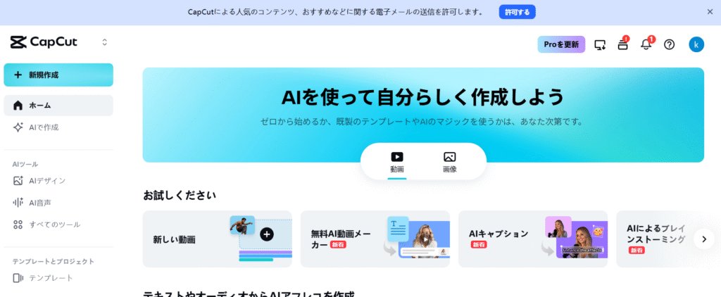まずは、CapCutアプリをスマートフォンにインストールします。アプリは無料でダウンロード可能です。インストールが完了したらアプリを起動し、ホーム画面を開きます。