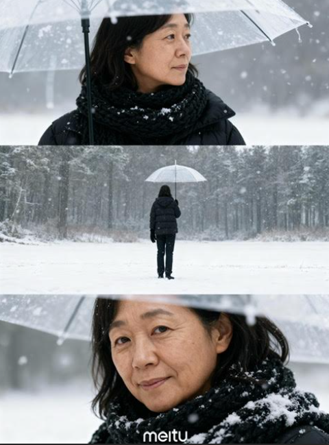 Meituの強みは、「AI加工」機能から「雪夜」などのテンプレートを選ぶだけで、人物を含めた世界観全体をAIが“再構築”してくれる点です。難しい操作は一切不要で、ワンタップで元の写真がドラマチックな雪景色イラスト風の作品に生まれ変わります。