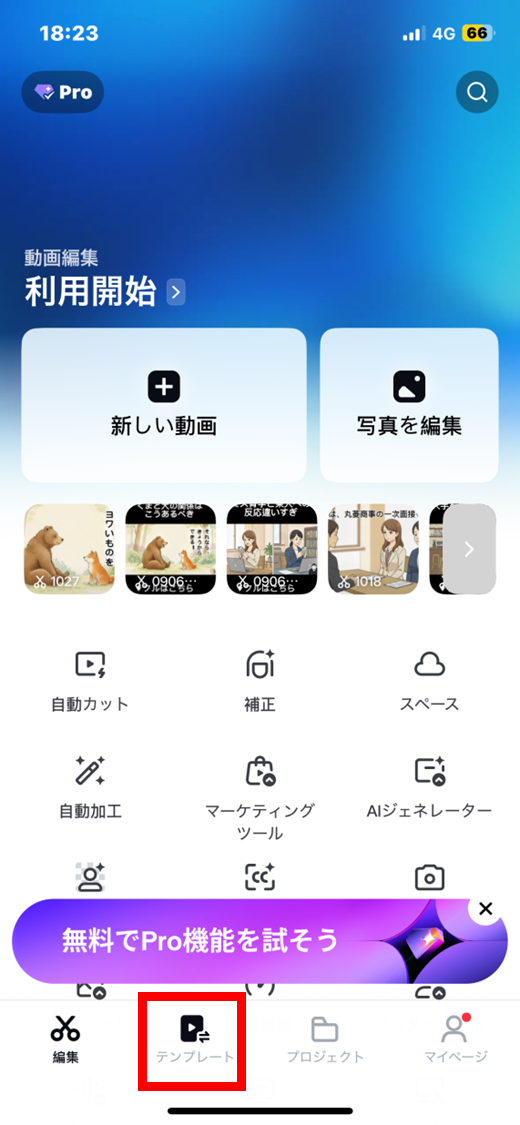 CapCutは動画編集のイメージが強いですが、写真編集機能も独立して存在します。ホーム画面の下部ににある「テンプレート」というアイコンをタップしてください。